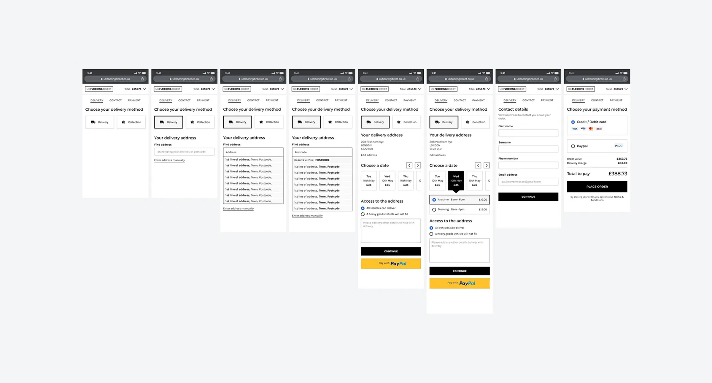 Research had provided us with a clear set of problems and needs that customers faced with the existing checkout. We also reviewed Hotjar recordings of customers using the checkout that backed this up; they had problems with the long single-page checkout screen and accessing the correct delivery costs and options, particularly on mobile devices. Defined design goals for the checkout were: