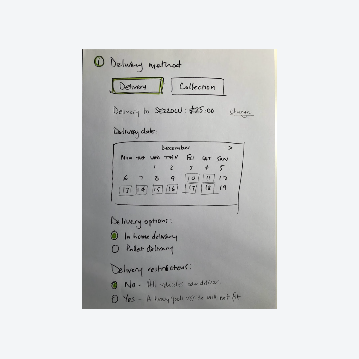 The initial concept revolved around a delivery option mechanism shown to customers at the basket step. This was tested (unmoderated) on usertesting.com, feedback was the screen was creating cognitive overload - “too much going on” - and they wanted to use the basket as a wish list to store possible purchases (our analytics data confirmed this was happening on the site).