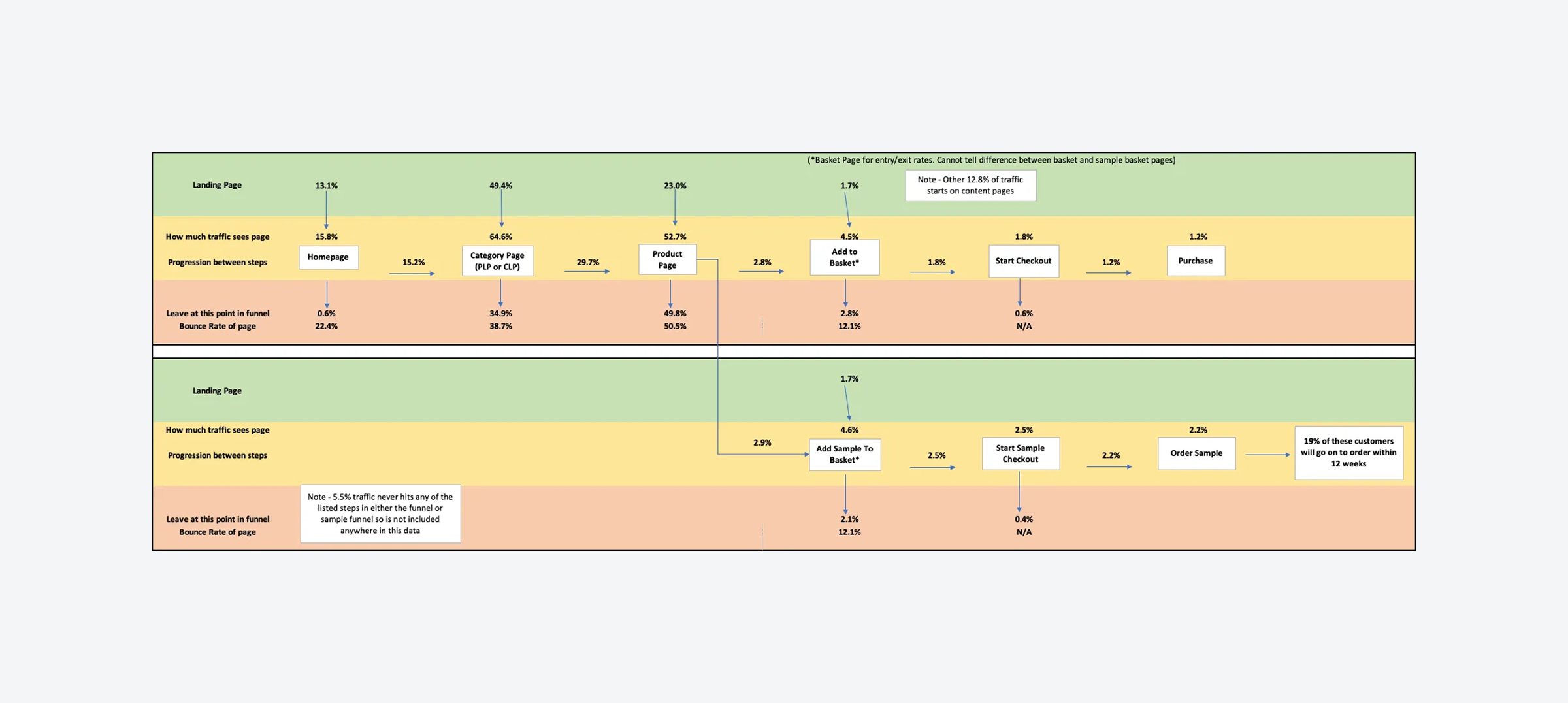 High-level user flows allowed us to see customer entry points, the progression from each step, and, crucially, where they tended to drop out. To gain insights into conversion rates, we undertook an in-depth analysis of the behaviour and interactions on the basket and checkout pages.